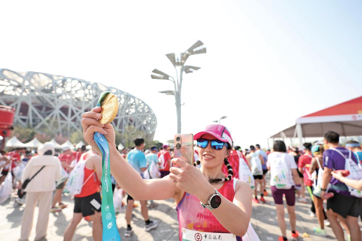 参赛选手完赛后,拿着奖牌在鸟巢前拍照留念。