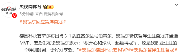 据央视网体育微博消息,樊振德国杯决赛萨尔布吕肯3-1战胜富尔达马伯策尔,东斩当选樊振东斩获留洋生涯首冠并当选MVP。获留